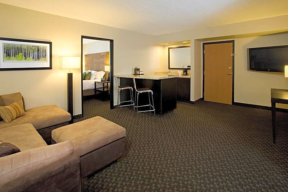 Featuring a large living room with an expansive sofa and a separate sink and vanity in the bedroom, this suite includes a granite-top wet bar, small refrigerator and microwave.